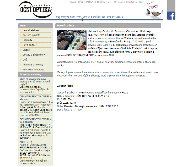 Historie firmy Oční optik Šafanda začíná rokem 1991 resp. 15.6.1991, kdy její zakladatel pan František Šafanda vydražil státní provozovnu oční optiky ve Vlašimi.