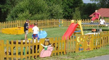 Dětské hřiště s trampolínou, houpačkami, pískovištěm, venkovní dámou.