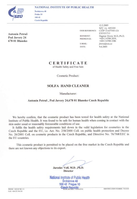 - čistící pastu SOLFA s abrazivním účinkem - určena na mytí silně znečištěné a mastné pokožky rukou