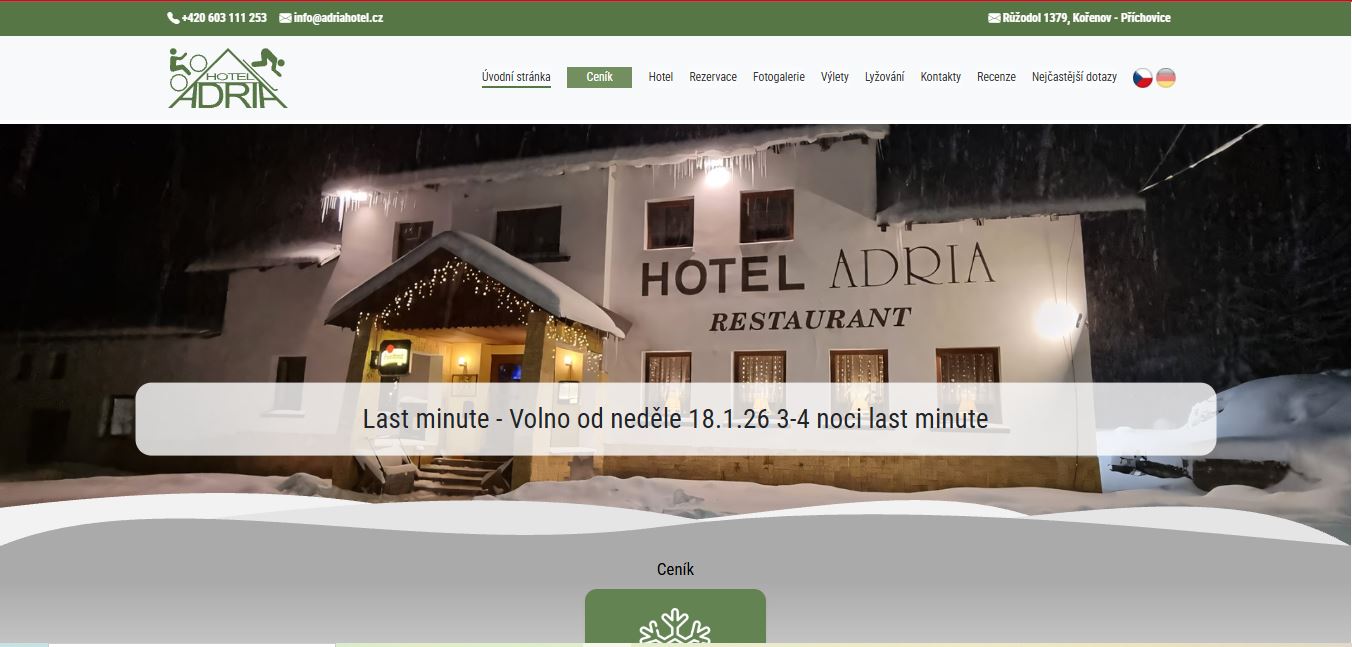 Vážení hosté, srdečně Vás zveme k pobytu v našem hotelu Adria, který je obklopen zelenými lesy Jizerských hor a malebnou přírodou.