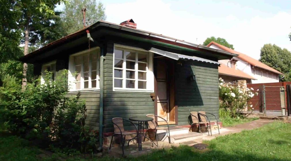 Ve srubu se nachází společenská místnost s malou kuchyňkou, ledničkou a krbovými kamny.