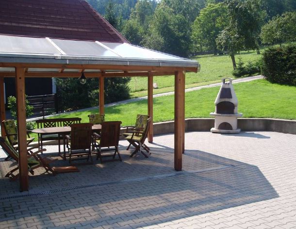 Každý objekt má venkovní posezení, hned vedle Dřevěnice je navíc nedstřešená pergola s vlastním venkovním krbem.