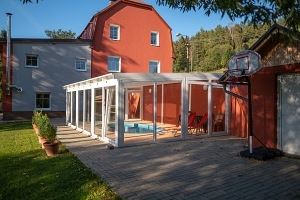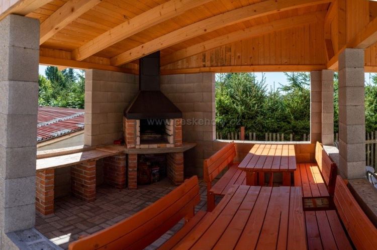 Na zahradě je k dispozici vyhřívaný bazén 6×3 m hluboký 1,2 m, zastřešený gril s posezením, zastřešený pingpongový stůl, trampolína, houpačky a basketbalový koš.